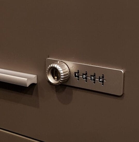 A 4-digit combination lock made of zinc, designed for wood doors (16-20mm thickness) with a left-sided mount, offering secure and customizable access.