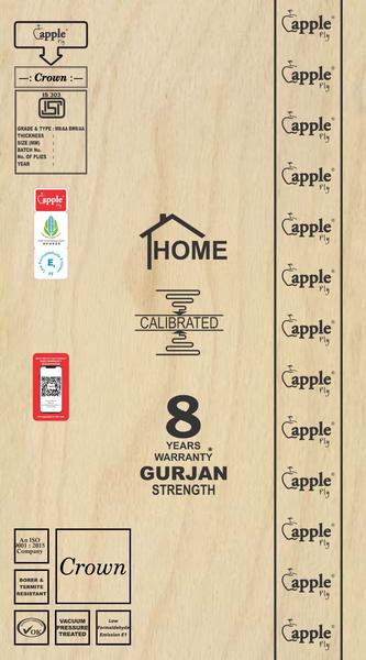 Apple Crown Signature Ply Is Made Of 100% Eucalyptus Species With Superior Bonding Strength. It Is Bonded With Phenol Formaldehyde Resin And Is Manufactured As Per Is 710 Standards.Apple Crown Signature Ply Has Been Industrially Vacuum Pressure Treated With Approved Preservatives To Make It Borer Proof And It Comes With 20 Years Warranty. This Material Is Produced As Per Double Pressing Technology Which Includes Calibration And Re Sanding In Imported Machinery "₹133.62 /Sq. Ft. ₹4368.84 /Sheet"