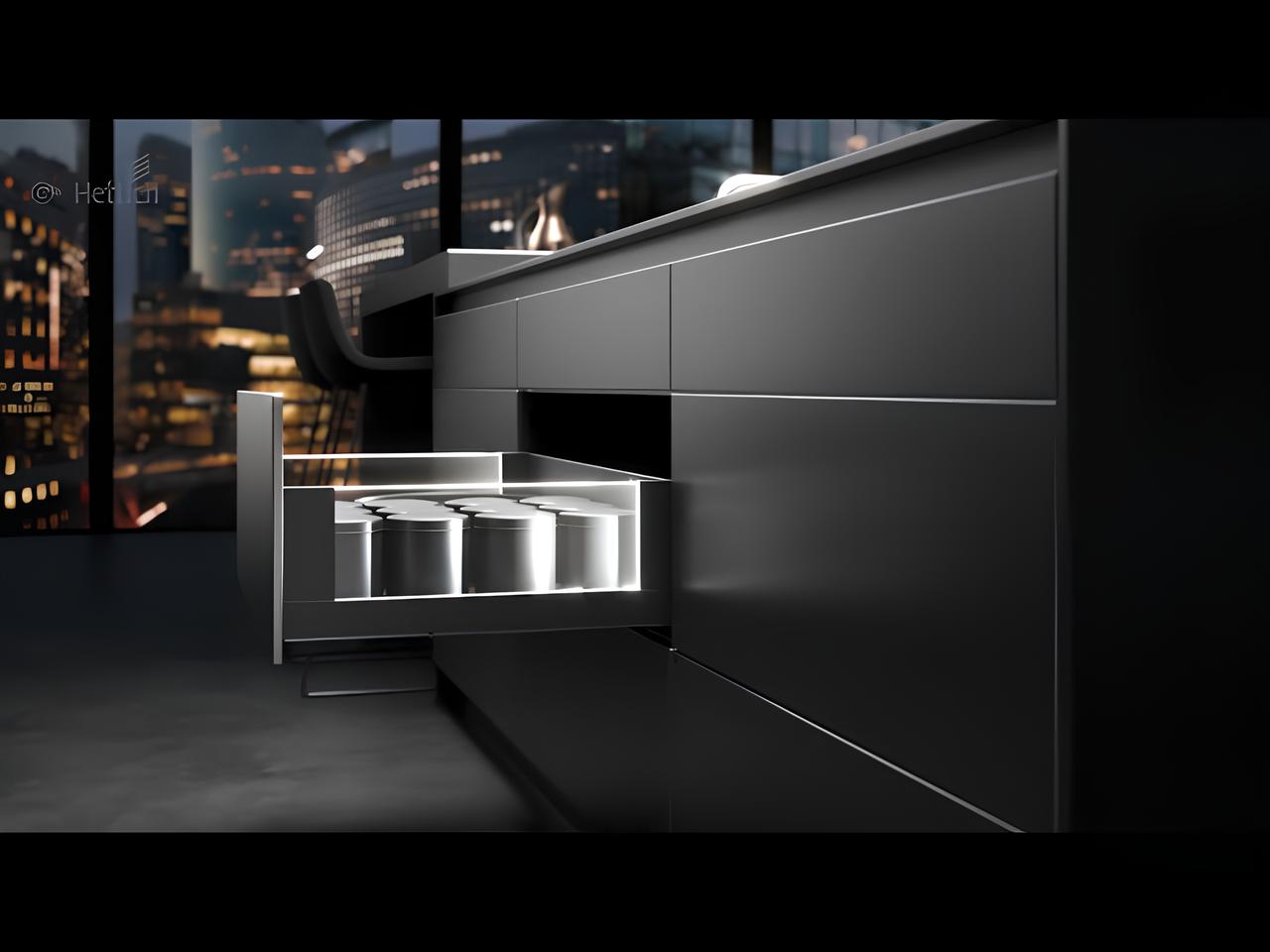 The AVT YOU Inlay LED Set is a light kit for Hettich AvanTech YOU drawers. It has slim LED strips that fit neatly into the drawer sides, giving a clean and modern look. The lights turn on when you open the drawer and turn off when you close it. It comes with everything you need—LED strips, battery or power supply, sensor, cables, and clips—so it’s easy to install without messy wires.