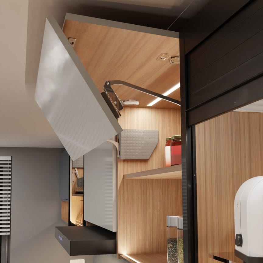 Eurolift Bifold Door System features a space-saving mechanism where cabinet doors fold and lift upwards in two sections. It offers smooth operation, easy access, and a modern look, making it ideal for contemporary kitchen designs.
