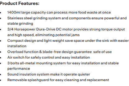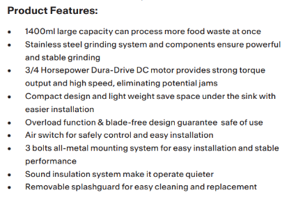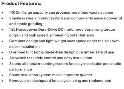 Franke Food waste disposer TE-125 1-1/4 HP, Capacity: 1400ML, Voltage: 220-240 V