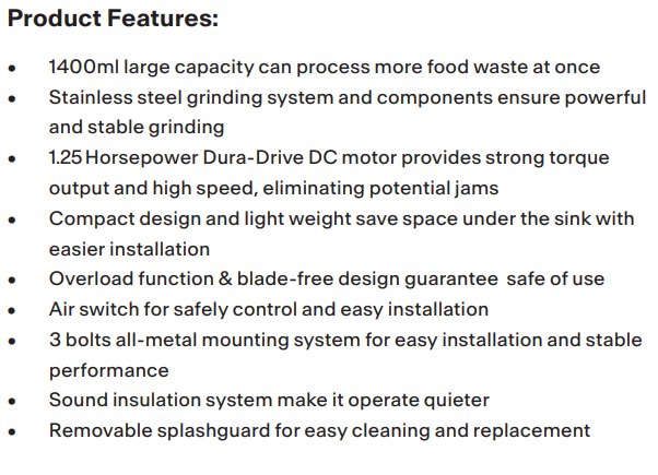 Franke Food waste disposer TE-125 1-1/4 HP, Capacity: 1400ML, Voltage: 220-240 V