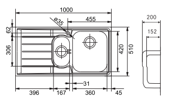 Franke NET 651 RHD, Double Bowl With Drainer, Stainless Steel, Satin, Dimensions 1000 x 510mm, Bowl Size 360 x 420mm