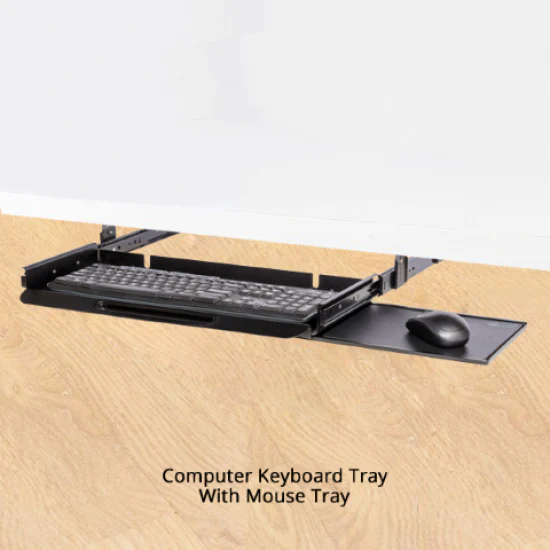 It is an ergonomic under-desk keyboard tray designed to enhance workspace efficiency and comfort. It features a retractable mouse tray that can be mounted on either the left or right side, providing flexibility based on user preference. The tray is crafted from durable materials with a sleek black finish, ensuring longevity and a modern aesthetic. Its compact design makes it an ideal choice for both home and office setups.
