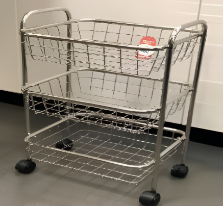 A kitchen utility trolley basket is a mobile storage unit with multiple baskets, designed to organize and transport kitchen items like fruits, vegetables, and utensils conveniently.