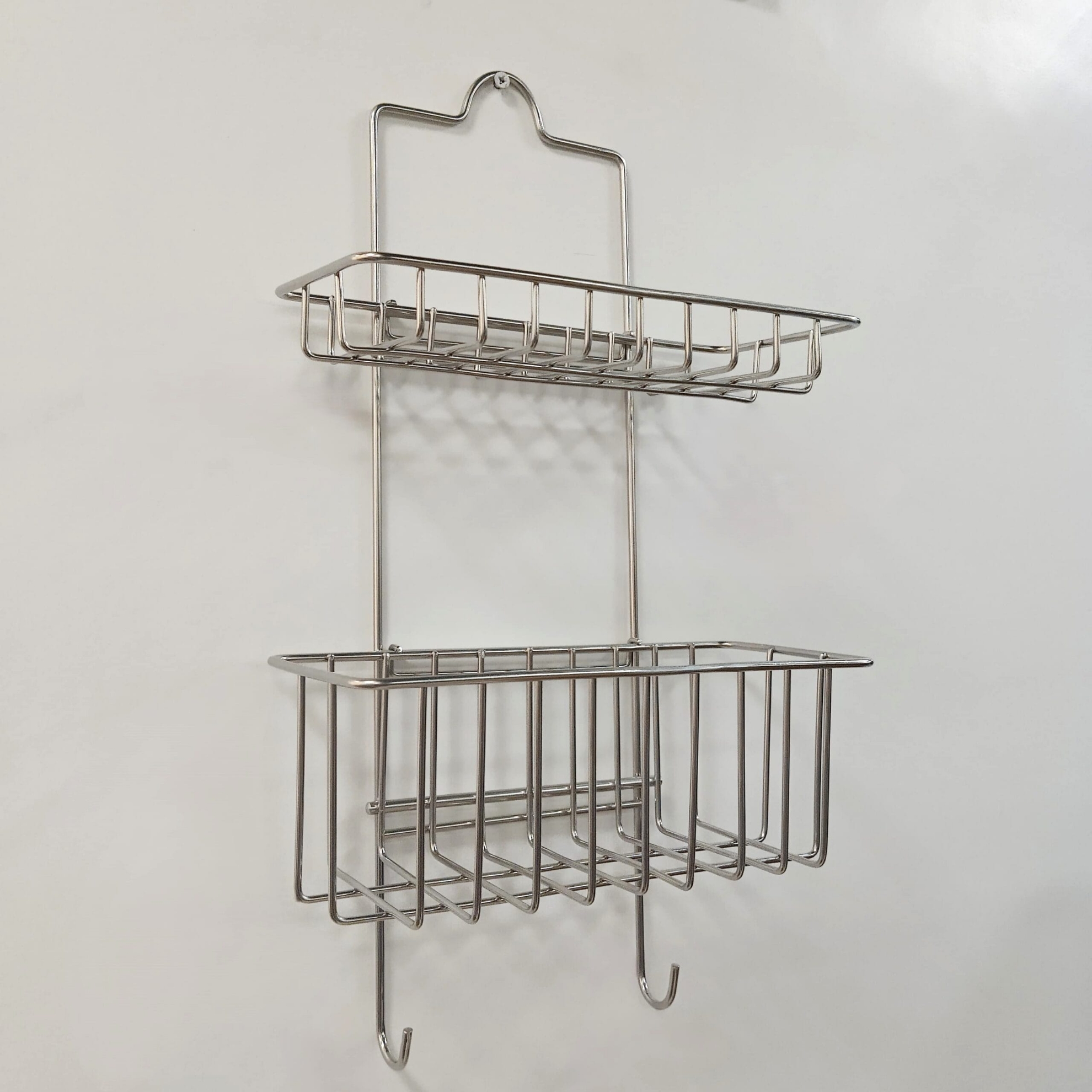 The Shower Hanger 2 Tier is a space-saving organizer that hangs over the showerhead, featuring two shelves for holding toiletries and hooks for accessories.